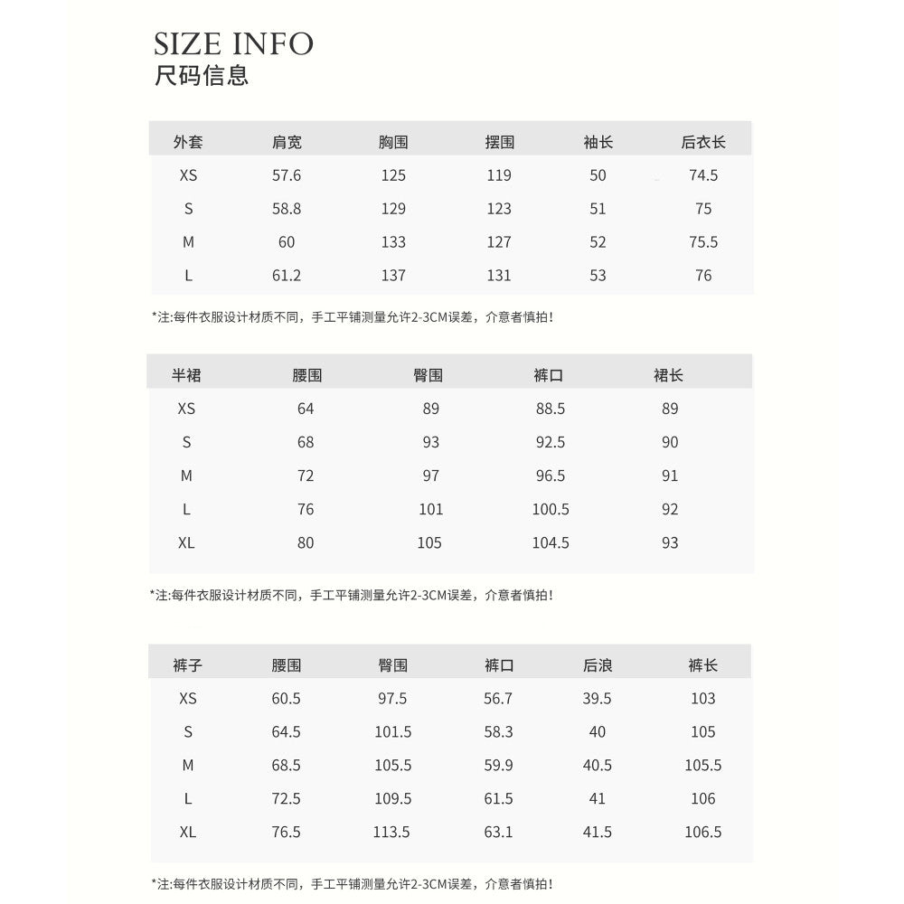 Color classification Cloud white long pants, cloud white half skirt, cloud white jacket, elephant gray long pants, elephant gray half skirt, elephant gray jacket, classic black long pants, classic black half skirt, classic black jacket, size chart. For more information, please contact customer service. Join the group to enjoy a 78% discount on each new item
