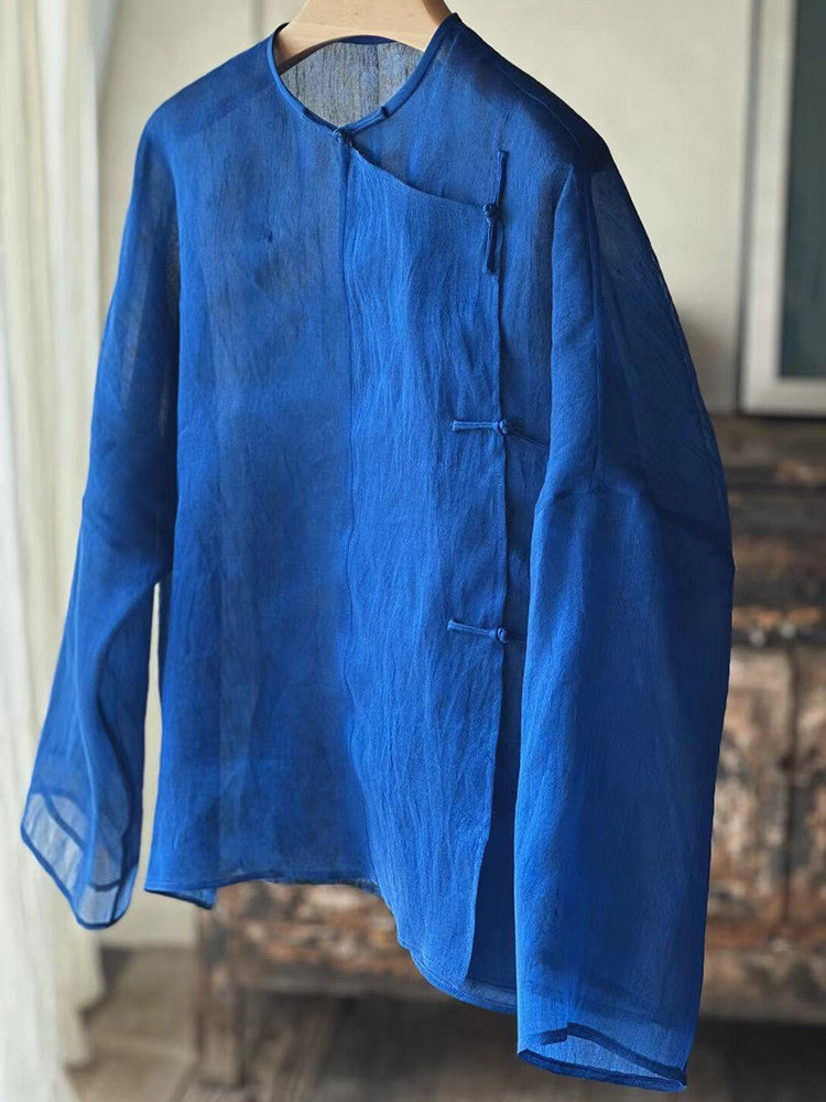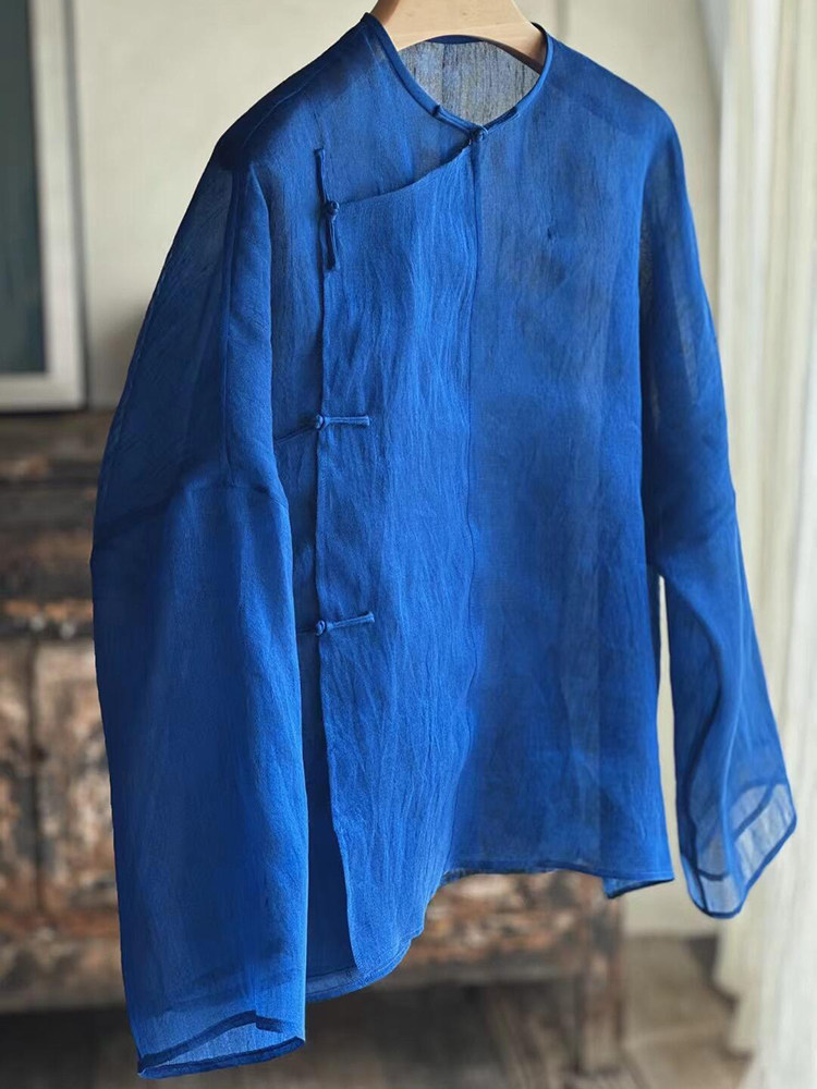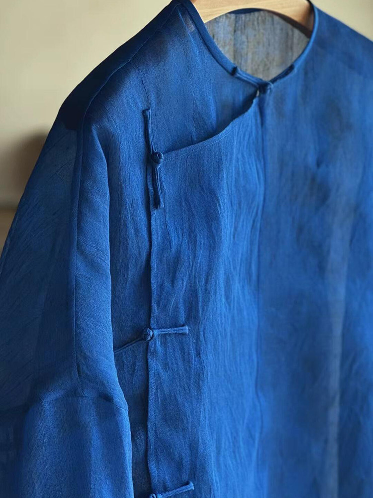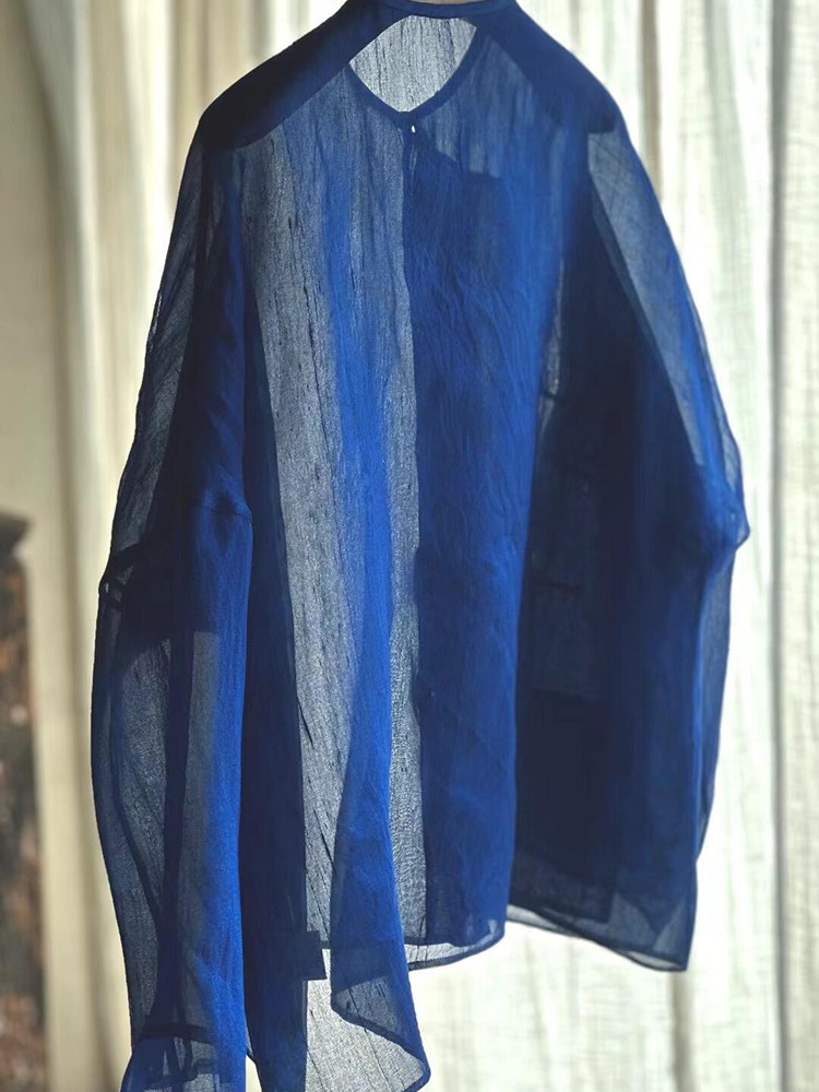 | Color classification | Blue ramie slant collar slightly transparent shirt |