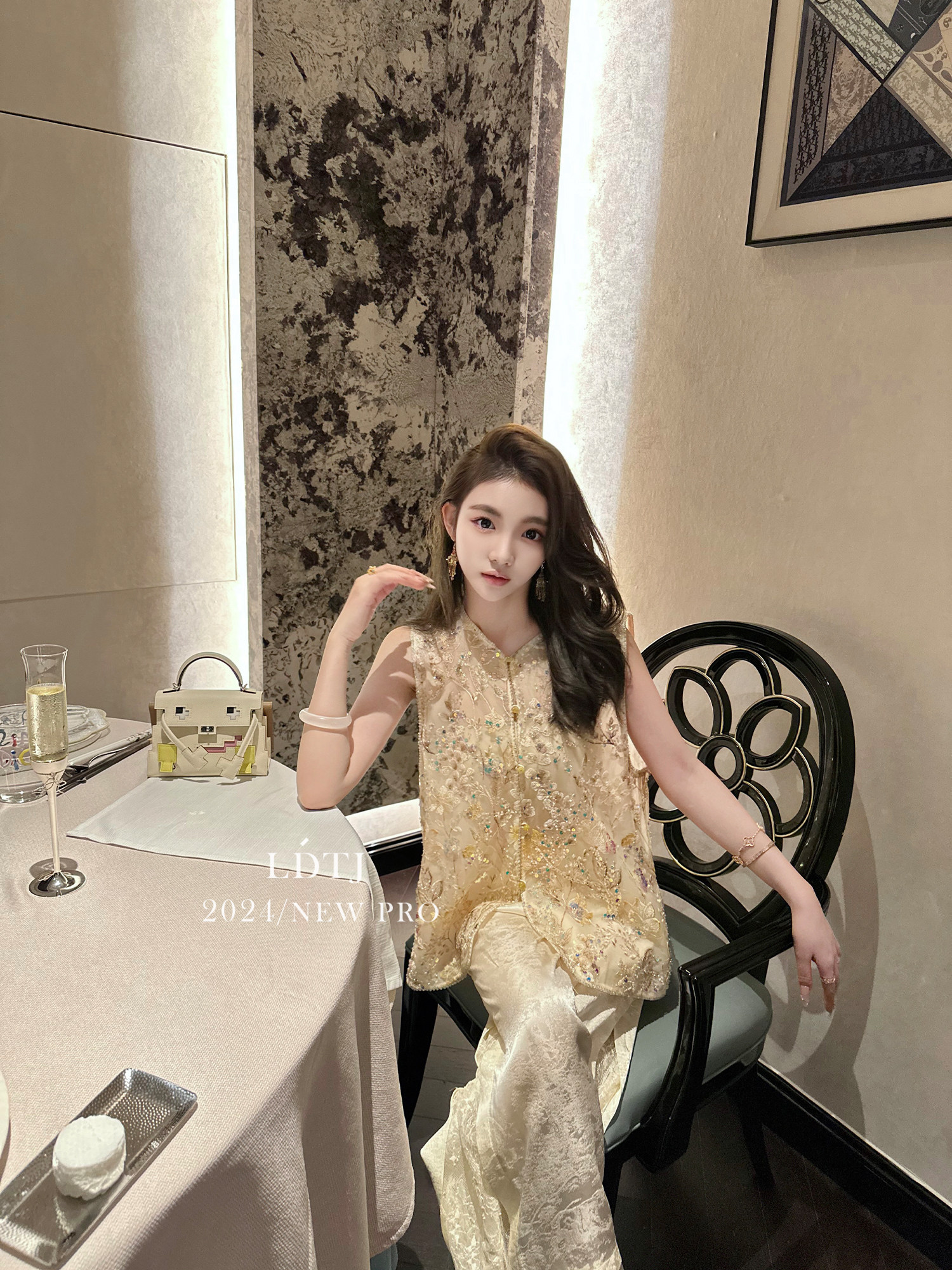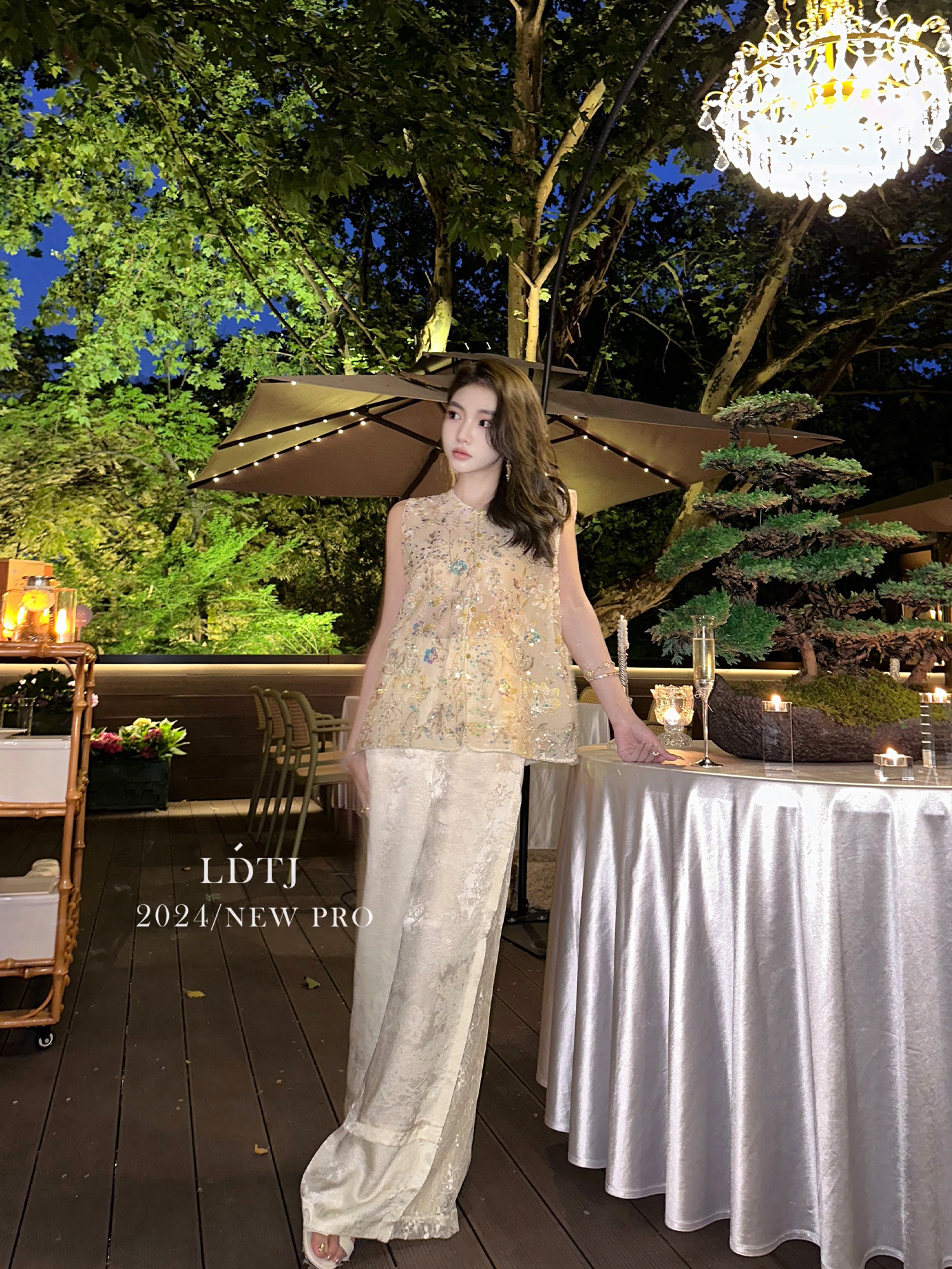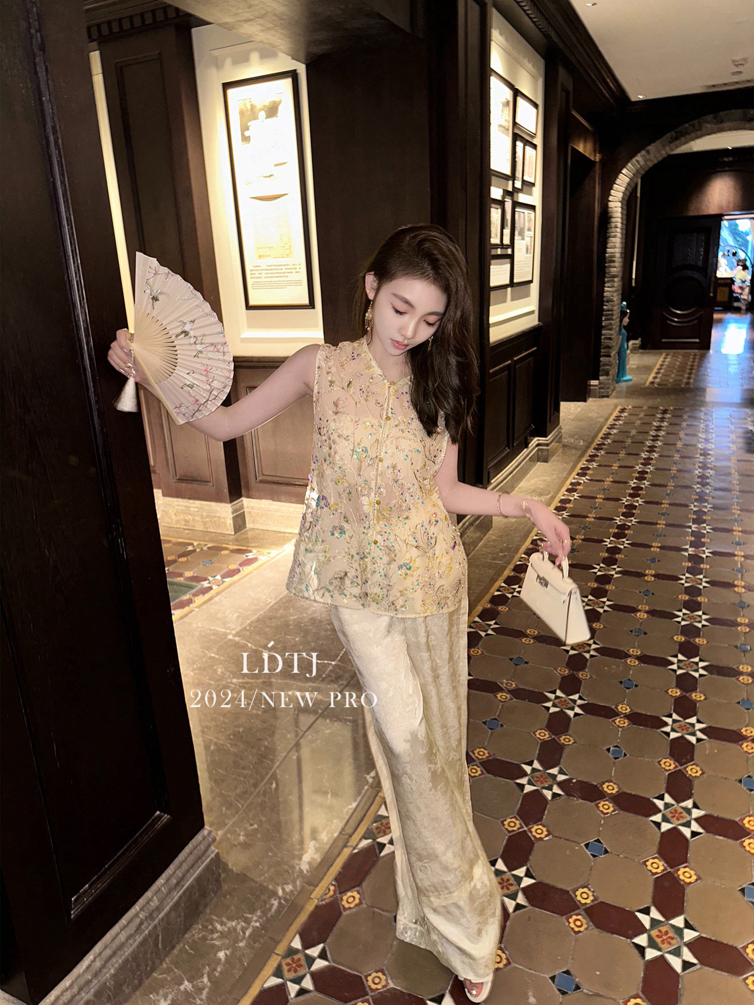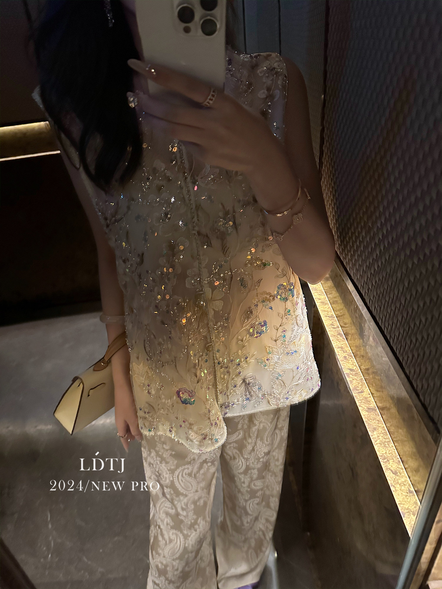 | color classification | Champagne colored vest top with real silk organza and heavy-duty bead embroidery craftsmanship counter matching quality, apricot colored pants with 100% human silk jacquard and imported lace stitching counter matching quality |