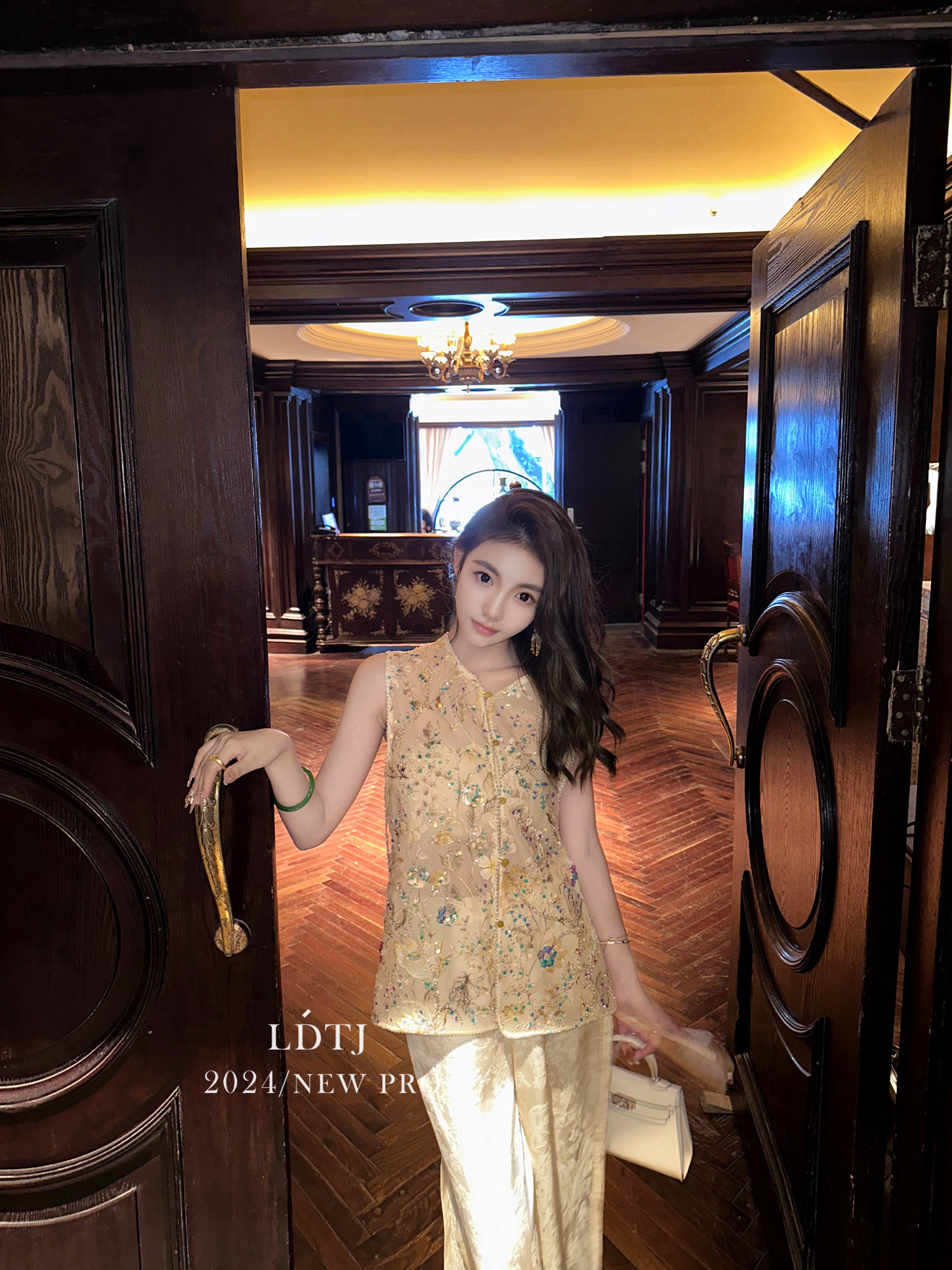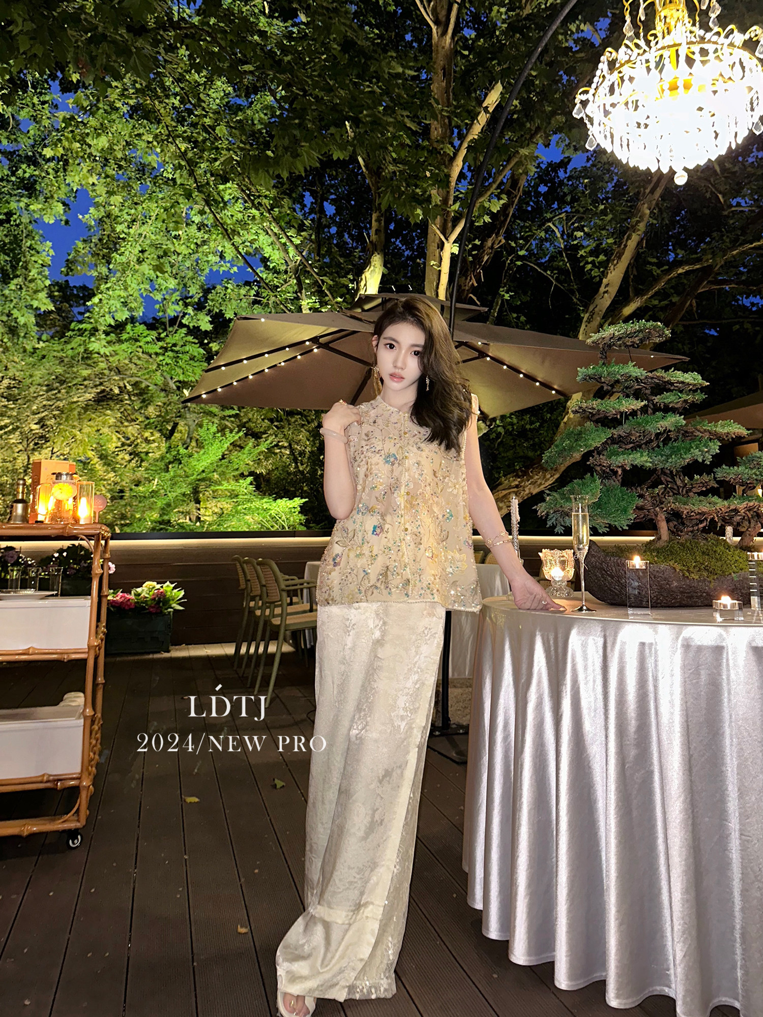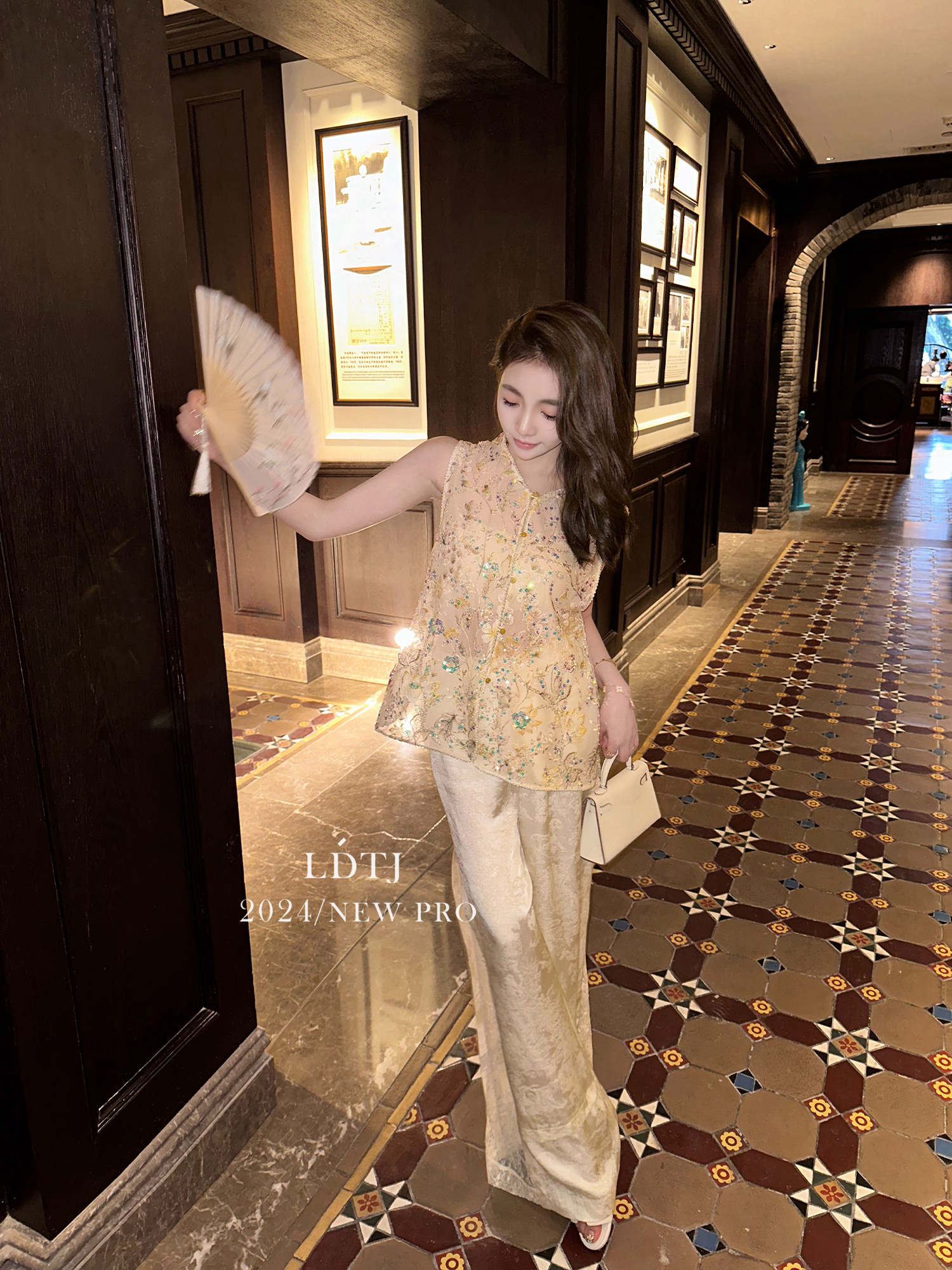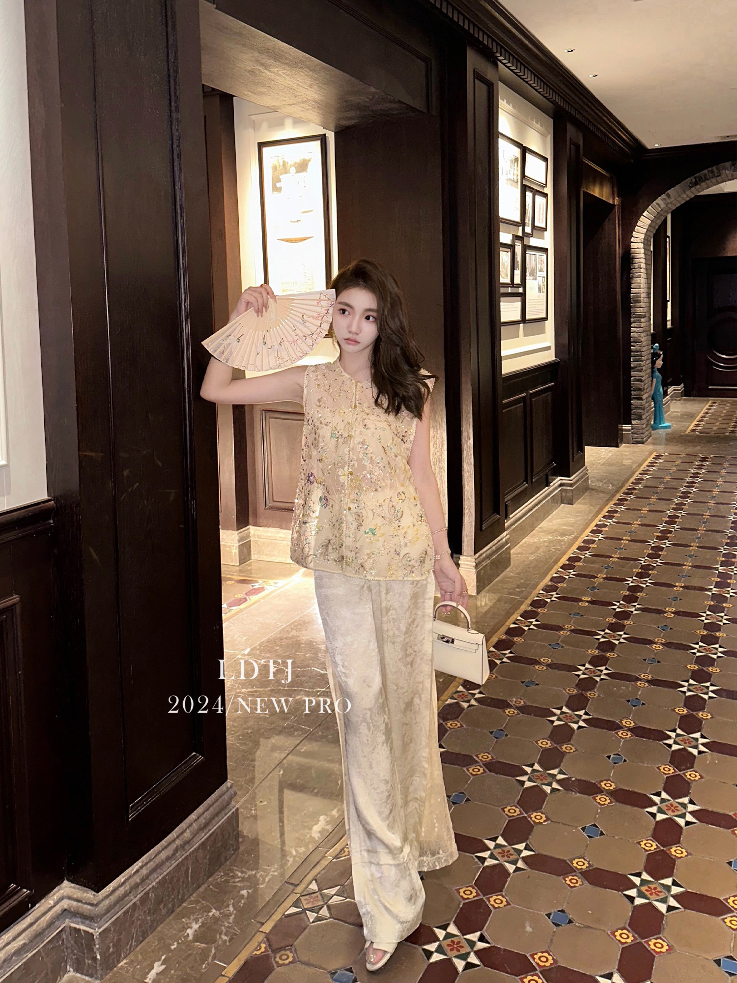 | color classification | Champagne colored vest top with real silk organza and heavy-duty bead embroidery craftsmanship counter matching quality, apricot colored pants with 100% human silk jacquard and imported lace stitching counter matching quality |