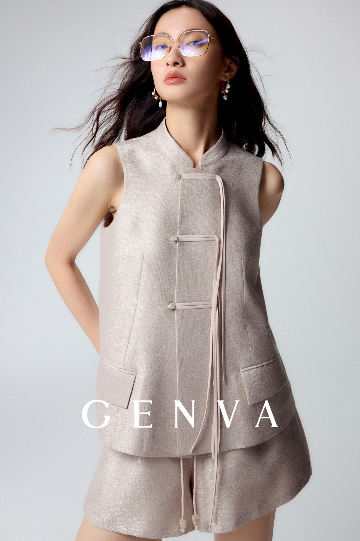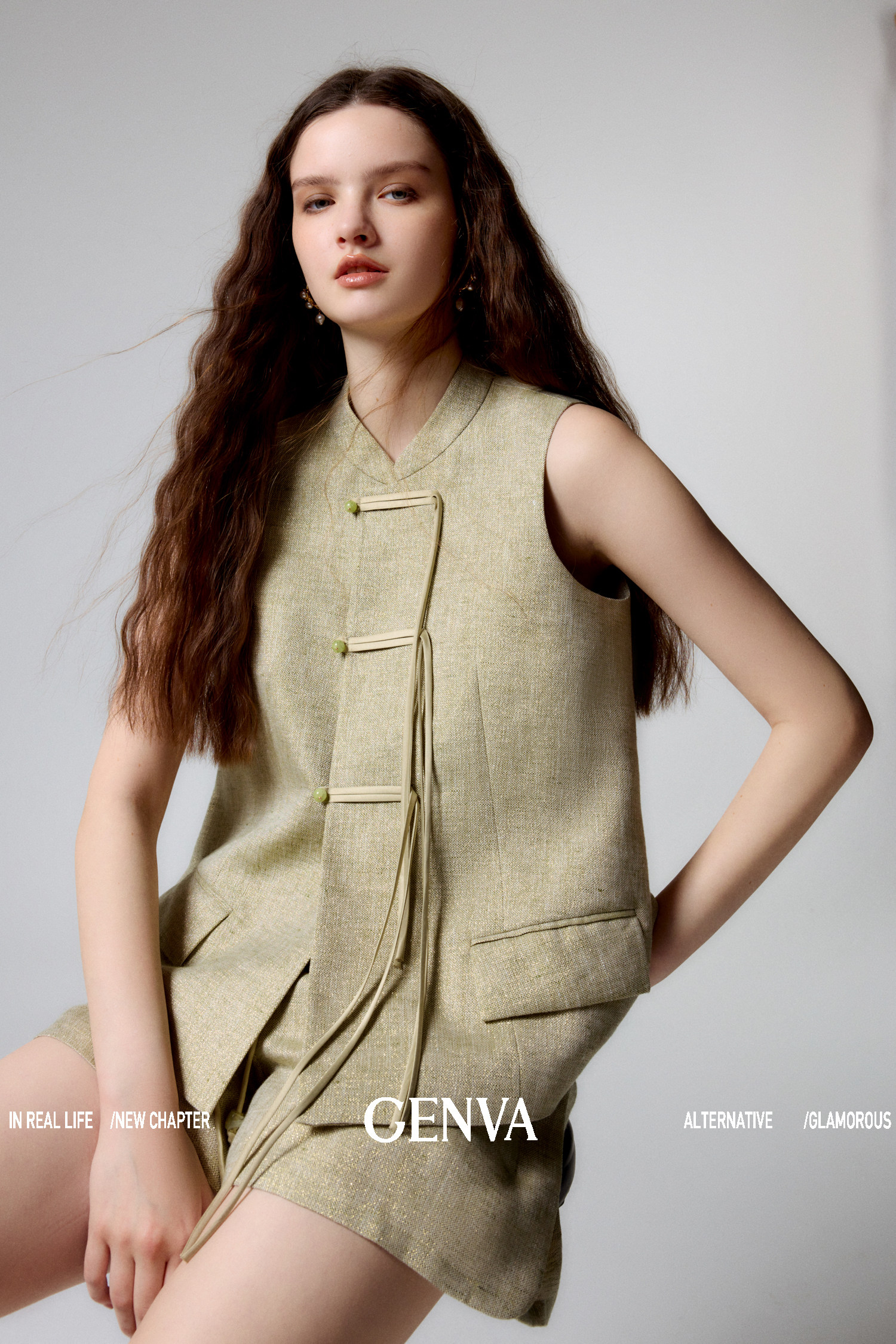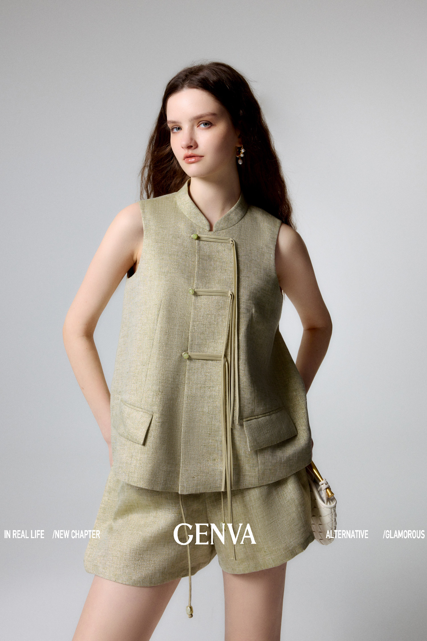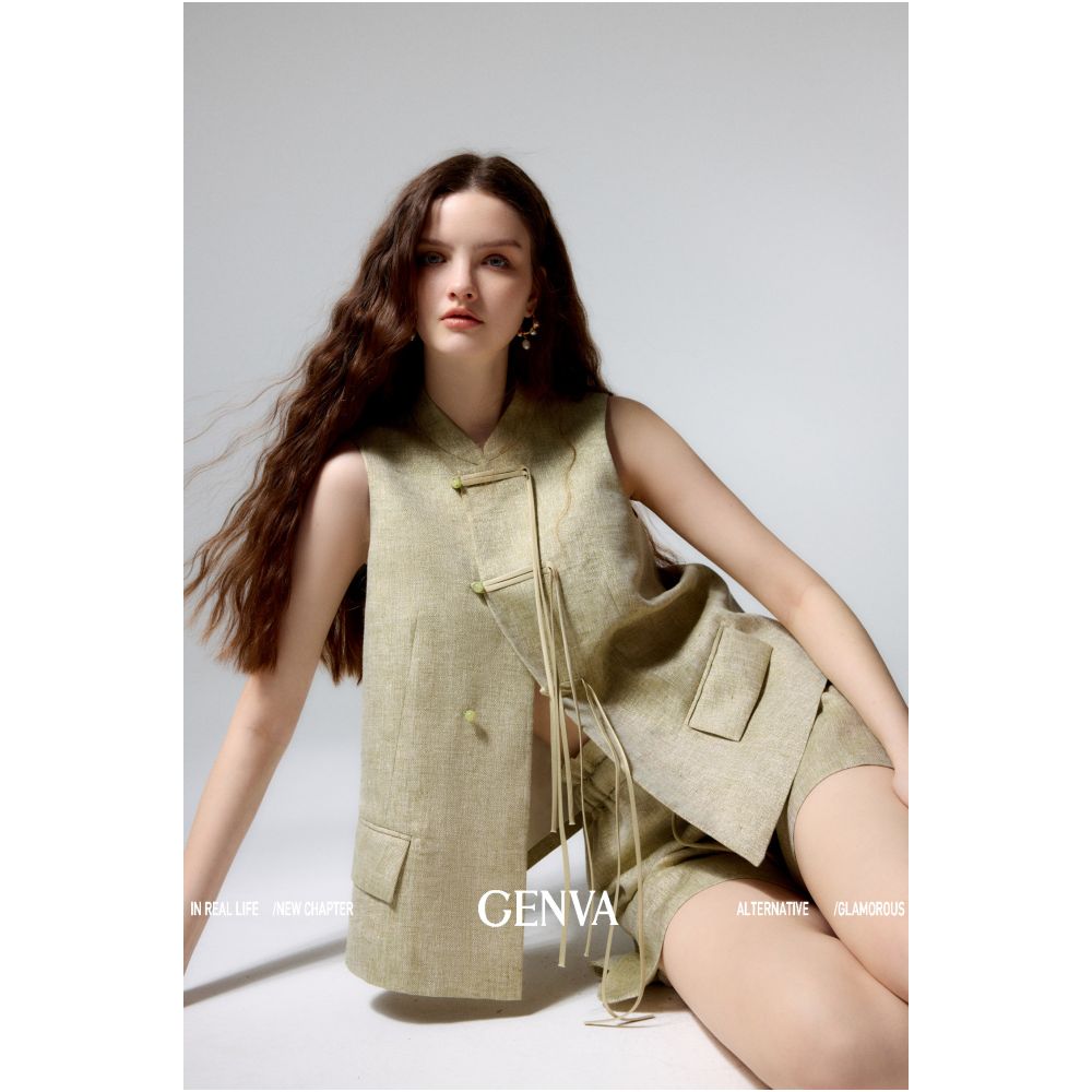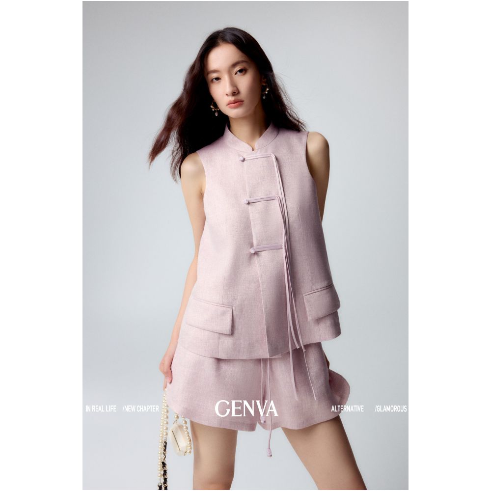 悦然定格 新中式飘带盘扣马甲+短裤套装